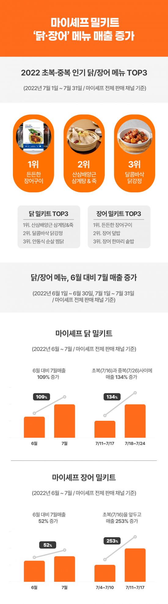 마이셰프의 판매 데이터에 따르면 다양한 닭 밀키트가 제품 판매 순위 안에 들며, 보양식으로 삼계탕뿐만 아니라 다양한 닭고기 메뉴를 선호하는 경향을 보인 것으로 나타났다. ‘산삼배양근 삼계탕&죽’에 이어 ‘달콤바삭 닭강정’과 ‘안동식 순살 찜닭’이 올해 7월 많이 팔린 닭 밀키트에 이름을 올렸다.
