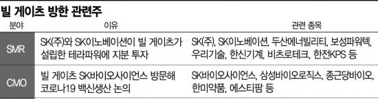 SMR 외에도 게이츠의 방한에 맞춰 CMO 관련주들에게도 관심이 모아지고 있다. 대표적인 CMO 관련주로는 SK바이오사이언스가 꼽힌다. 게이츠가 SK바이오사이언스를 방문해 코로나19 백신 생산에 대해 논의할 것으로 알려지면서다. ‘코로나19 국제공조’가 게이츠의 방문 목적인 만큼 오늘 국회에서도 관련 주제로 연설을 하고, 윤석열 대통령과 면담에서도 저개발 국가의 백신지원을 위한 협력방안에 대해서도 논의할 예정이다. 앞서 게이츠는 2014년 SK케미칼의 장티푸스 백신 임상 연구에 490만달러(약 64억원) 지원을 시작으로 2020년 SK바이오사이언스의 코로나19 백신개발에 360만달러(약 47억원)와 1000만달러(약 131억원)를 순차 지원한 바 있다.