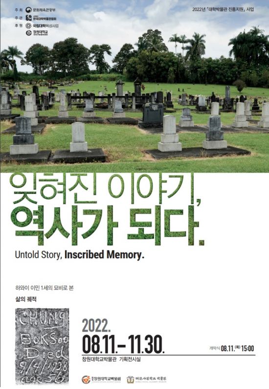 [아시아경제 영남취재본부 이세령 기자] 창원대학교 박물관과 해군사관학교 박물관이 한미수교 140주년과 하와이 이민 120주년을 기념해 ‘잊혀진 이야기, 역사가 되다-하와이 이민 1세의 묘비로 본 삶의 궤적’ 연합특별전시회를 마련했다.