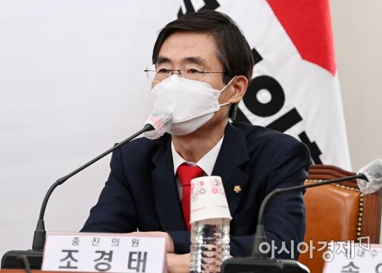 조경태 국민의힘 의원이 21일 국회에서 열린 더불어민주당의 ‘검수완박’ 법안 강행처리 저지를 위한 당 대표-중진의원 긴급 연석회의에 참석, 모두발언을 하고 있다./윤동주 기자 doso7@