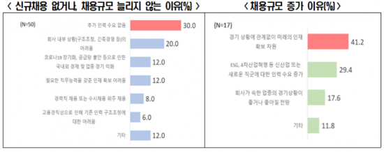 반대로 신규 채용을 늘리겠다고 응답한 기업은 그 이유로 ▲경기 상황과 관계없이 미래 인재 확보 차원(41.2%) ▲신산업 또는 새로운 직군에 대한 인력 수요 증가(29.4%) ▲회사가 속한 업종의 경기 상황이 좋거나 좋아질 전망(17.6%) 등을 답했다.