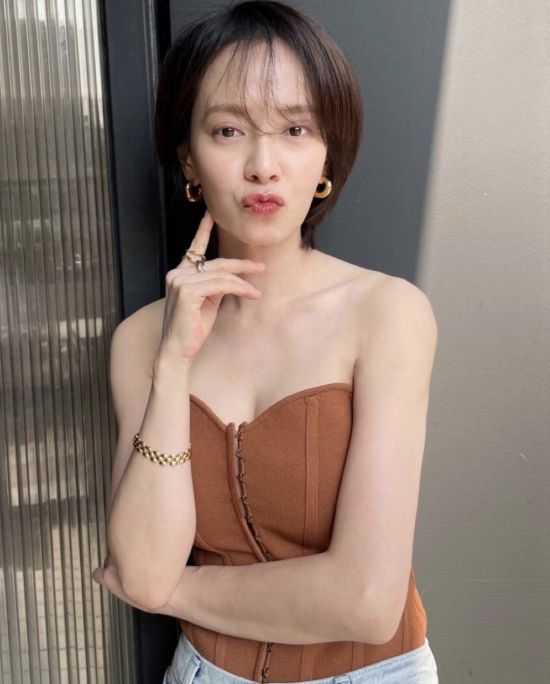 사진 속 송지효는 갈색 튜브톱과 찢어진 청바지를 입고 햇빛을 받으며 다양한 포즈를 취하고 있다. 붉은 립과 골드 액세서리로 포인트를 주었다.