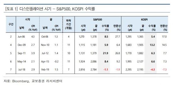 강민석 교보증권 연구원은 "2000년 이후 인플레이션이 꺾이고 내려오는 구간은 8구간 정도로, 2000년도 IT버블 붕괴와 2008년 글로벌 금융위기, 코로나19와 같이 경제위기로 급격하게 내려오는구간(1,3,8구간)을 제외하면 증시는 양호한 모습을 보였다"고 전했다.