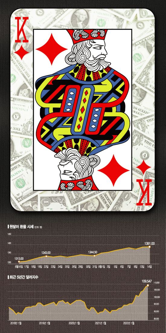 달러 가치가 고공행진을 하면서 달러 투자가 주목받고 있다. 올해 초 1200원 안팎이던 원·달러 환율은 이달 들어 1400원을 돌파할 기세다. 우크라이나와 전쟁에 나선 러시아가 유럽으로 가는 천연가스를 중단하면서 촉발된 에너지 대란이 세계 경제를 침체로 이끌 수 있다는 우려가 안전자산인 달러 가치를 끌어올렸다. 최근 발표된 미국의 8월 소비자물가지수(CPI)가 시장 예상치를 웃돌면서 미국 연방준비제도(Fed)가 고물가를 잡기 위해 더욱 강도 높은 긴축에 나설 것으로 전망되며 달러 가치는 더욱 치솟을 수 있다는 전망이 나온다.