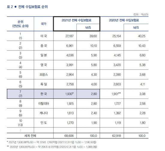 세계 보험시장에서 한국의 수입보험료 규모는 7위로 전년과 같은 순위다. 미국이 2조7187억달러로 1위를 차지한 가운데 중국이 6961억달러로 2위, 일본이 4036억달러로 3위, 영국이 3991억달러로 4위, 프랑스가 2964억달러, 독일이 2758억달러였다. 지난해 한국 보험산업의 세계시장 점유율은 전년 대비 0.2%포인트(P) 하락한 2.8%였다.