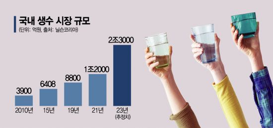 19일 닐슨코리아에 따르면 2010년 3900억원 수준이었던 생수시장 규모는 2015년 6408억원에 이어 2019년 8800억원, 지난해는 1조2000억원 규모로 급성장했다. 내년에는 2조3000억원까지 확대될 것으로 예상된다.