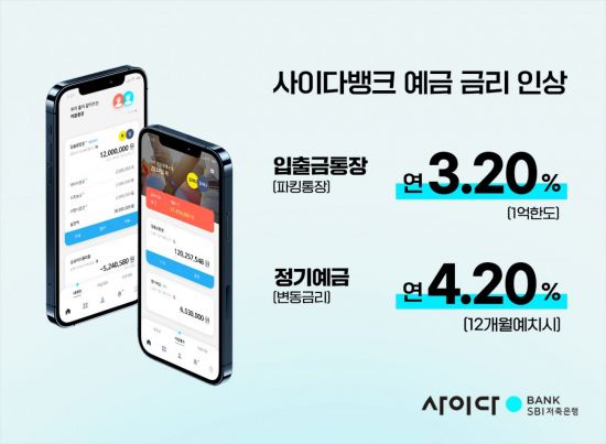 [아시아경제 송승섭 기자] SBI저축은행은 21일 금융플랫폼 ‘사이다뱅크’ 수신상품 금리를 0.25~1%포인트 인상했다. 금리인상은 사이다뱅크 보통예금(파킹통장), 복리정기예금, 복리정기예금(변동금리), 복리자유적금이 대상이다. 보통예금(파킹통장)은 1%포인트 인상된 3.2%, 복리정기예금은 0.35%포인트 올라 4%를 기록했다. 복리정기예금(변동금리)은 0.25%포인트 인상된 4.2%, 복리자유적금은 0.35%포인트 인상된 4%로 바뀐다.