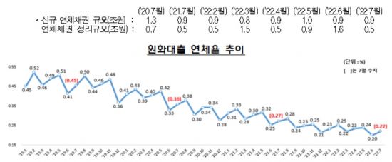 22일 금융감독원에 따르면 7월 말 국내은행의 원화 대출 연체율(1개월 이상 원리금 연체 기준)은 0.22%로 전월 말(0.20%) 대비 0.02%포인트 상승했다. 전년 동월 말 대비로는 0.05%포인트 하락했다. 연체율은 은행이 분기 말에 연체채권 관리를 강화함에 따라 통상적으로 분기 중 상승했다가 분기 말에 하락하는 경향을 보인다. 국내은행 연체율은 지난해 6월 0.2%대로 떨어진 이후 0.2%대에서 소폭의 등락을 반복하고 있다.