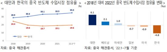대만은 미국의 수출통제로 인한 중국의 반도체 공급부족 상황을 대중국 수출 증대의 기회로 활용하는 중이다. 미국의 수출규제로 중국의 시스템 반도체 조달이 대만에 집중된 반면, 메모리 위주의 한국은 메모리반도체 가격 하락, 주요 수요기업인 중국 화웨이의 구매 중단 등으로 중국 내 시장 점유율이 하락했다.