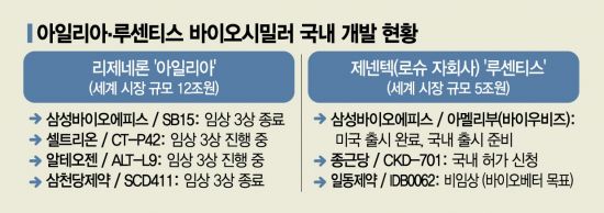 두 제품 간의 효능·부작용은 큰 차이가 없는 것으로 알려져 있다. 하지만 매달 맞아야 하는 루센티스와 달리 아일리아는 첫 3개월 이후에는 두 달마다 맞으면 돼 투약 편의성이 크게 갈리면서 몇 년 늦게 출시된 아일리아가 시장을 빠르게 장악한 상태다. 연간 매출도 지난해 기준 아일리아 94억여달러(약 13조원), 루센티스 36억여달러(약 5조원)로 크게 벌어진 상태다. 특히 세계적으로 노인 인구가 증가하는 만큼 데이터 분석기관 글로벌데이터는 미국·독일·일본·중국·호주 등 주요 9개국의 습성 황반변성 치료제 시장 규모가 2028년에는 187억달러(약 27조원)에 이를 것으로 추산하기도 했다.