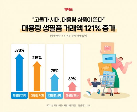 지난 몇 년간 증가했던 '소포장' 상품 구매 패턴이 대용량 상품 구매로 변화한 것은 생필품 가격 인상에 더해 MZ세대(밀레니얼+Z세대)를 중심으로 절약형 소비 트렌드가 부상한 데 따른 것이다. 위메프 관계자는 "대용량 상품을 선호하는 추세는 고물가, 경기 불황 등으로 당분간 지속될 것"이라며 "생필품은 물론 카테고리별 대용량 상품을 더 저렴한 가격에 선보일 수 있도록 파트너사들과 함께 다양한 프로모션을 전개하겠다"고 말했다.