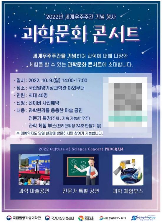 국가기상위성센터, 경남테크노파크, 한국과학우주청소년단과의 협업으로 세계우주주간을 홍보하고 과학문화 대중화에 기여하기 위해 이날 행사를 연다. 과학문화콘서트는 오는 10월 8일까지 네이버를 통해 사전예약(40명)한 관람객을 우선으로 운영할 예정이다.