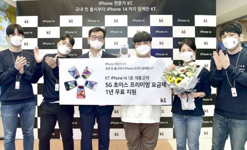 KT는 공식 온라인몰 KT 샵에서 아이폰14를 사전 예약한 고객들을 대상으로 이벤트를 진행했다. 1호 개통 고객에게 KT 최상위 요금제인 5G 초이스 프리미엄 요금제(월 13만원) 1년 이용 혜택과 맥세이프 등 아이폰 액세서리 사은품들 제공한다.