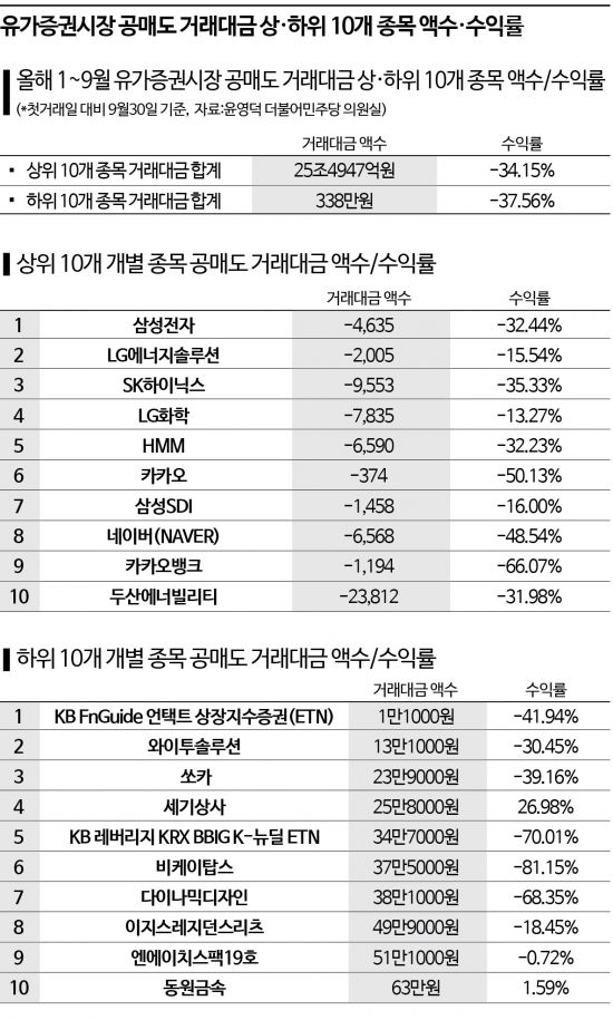 코스닥 시장에선 에코프로비엠(2조6940억원)의 공매도 거래대금이 가장 컸는데 연초대비 24.95% 하락했고, 이보다 공매도가 적은 위메이드(8500억원)는 75.10%나 하락했다.