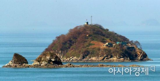 서해 북방한계선(NLL) 인근 무인도인 함박도를 두고 '영토 논란'이 이어지고 있는 가운데 24일 오전 인천 강화군 서도면 말도리에서 바라 본 함박도에 북한의 군 시설이 보이고 있다. 국방부는 최근 함박도는 서해 북방한계선(NLL) 북쪽 약 700m에 위치해 북측 관할 도서인 것을 현장 확인했다고 밝혔다./사진공동취재단