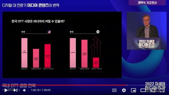 이날 기조연설을 맡은 양 대표는 "한국 OTT 유료 OTT 가입 가구는 현재 36%인 712만가구"라며 "미국의 83%에 비하면 낮은 수준으로 수평 비교로 보긴 힘들겠지만, 아직 절반 정도만 왔다고 생각한다"며 이같이 말했다.