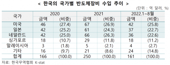 한국은 이들 업체로부터 반도체 장비를 수급받다 보니 의존도가 컸다. 지난해 기준 반도체 장비 1~3위 수입국으로 중국(386억달러), 대만(298억달러), 한국(250억달러)이 이름을 올렸다. 특히 한국은 대만, 중국보다 해외 장비 수입 의존도가 컸다. 지난해 기준 한국은 미국, 일본, 네덜란드산 장비 수입 의존도가 77.5%에 달했다. 대만(70.6%), 중국(56.2%)과 비교해 높은 수치다.