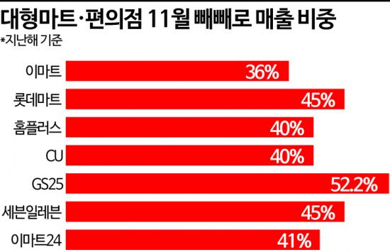 7일 대형마트와 편의점에 따르면 11월 빼빼로 매출은 연간 매출의 상당 부분을 차지하고 있다. 이마트에서는 지난해 11월 빼빼로 매출이 연간 매출의 36%를 차지했다. 같은 기간 롯데마트에서는 45%, 홈플러스에서는 40%로 집계됐다. 편의점에서도 비슷한 경향을 보였다. CU는 연간 매출의 40%, GS25는 52.2%, 세븐일레븐 45%, 이마트24는 41%로 나타났다. 1년간 판매된 전체 빼빼로 가운데 절반가량이 11월 한 달 동안 팔려나가고 있는 셈이다.