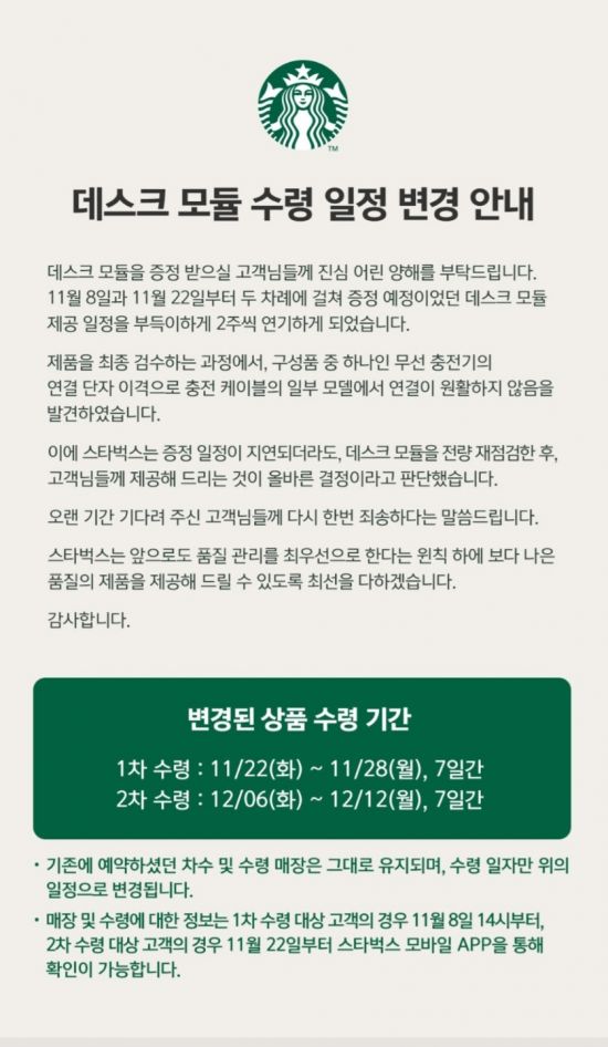 스타벅스코리아는 4일 자사 홈페이지에 고객 공지문을 올려 "8일과 22일부터 두 차례에 걸쳐 증정 예정이었던 데스크 모듈 제공 일정을 부득이하게 2주씩 연기하게 됐다"고 밝혔다. 이는 제품을 최종 검수하는 과정에서 구성품 중 하나인 무선 충전기의 연결 단자 이격으로 충전 케이블의 일부 모델에서 연결이 원활하지 않은 것을 발견했기 때문이라는 것. 스타벅스 측은 "증정 일정이 지연되더라도 데스크 모듈을 전량 재점검한 후, 고객에게 제공해 드리는 것이 올바른 결정이라고 판단했다"며 "오랜 기간 기다려 준 고객에게 다시 한번 죄송하다"고 말했다.