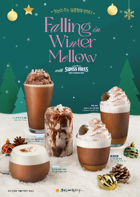 신메뉴 3종은 스위스미스의 시그니처 마시멜로 파우더를 활용했다. 코코아의 진한 풍미와 우유 거품이 어우러진 '초코멜로우라떼', 부드러운 마시멜로가 올라간 '스노우초코프라페', 진한 초콜릿과 고소함 밤이 어우러진 '초코밤라떼'를 선보였다.