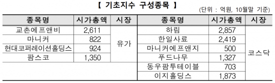 기초 지수는 교촌에프앤비, 팜스코등 유가증권시장 4종목과 하림, 한일사료 등 코스닥시장 6종목으로 구성됐다. 매년 6월과 12월 정기변경마다 지수 산출기관인 에프앤가이드가 최근 1년 동안의 증권사 리포트와 사업보고서 등에 기반해 구성 종목과 치킨 산업 간의 연관성을 평가한다.
