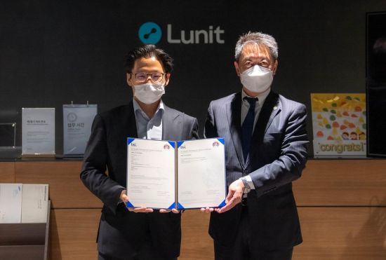 서범석 루닛 대표(왼쪽)와 신가이 테루오 BSI APAC 사장이 서울 강남구 루닛 본사에서 열린 '유럽 인증 수여식'에서 유럽 MDR CE 인증서를 들고 기념 촬영을 하고 있다. (사진제공=루닛)