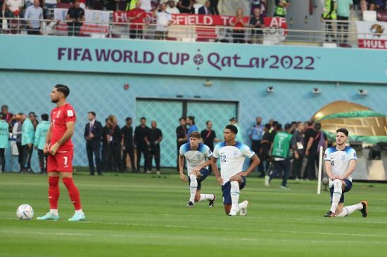 잉글랜드 축구 대표팀이 2022 국제축구연맹(FIFA) 카타르 월드컵 첫 경기에서 '무릎 꿇기' 퍼포먼스를 했다. 주장 해리 케인(토트넘)을 비롯한 선수들은 21일 카타르 알라얀의 칼리파 인터내셔널 스타디움에서 열린 이란과의 조별리그 경기를 시작하기 전 일제히 그라운드에 한쪽 무릎을 꿇은 뒤 일어났다.