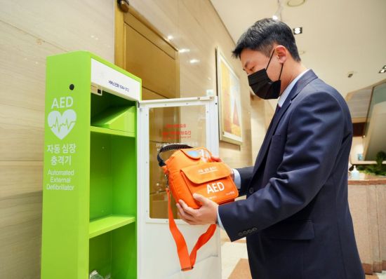 본점에는 본체·배터리·전극패드·가방·레스큐킷 등으로 구성된 스탠드형 자동심장제세동기가 대강당, 로비, 직원 식당 등 다중이용 시설과 엘리베이터(홀수층) 옆에 설치됐다.