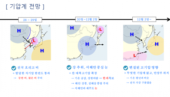 30일부터 1일 사이에 전라 서해안과 제주도에는 첫눈이 내릴 것으로 예상된다. 수도권 지역은 대체로 맑은 날씨가 이어질 것으로 보인다. 강풍으로 인해 30일부터 1일까지 전 해상에 풍랑주의보, 먼 바다를 중심으로 풍랑 경보가 발표될 가능성이 있다. 전 해안과 도서지역, 강원 산지를 중심으로 강풍 특보가 발표될 수 있다.