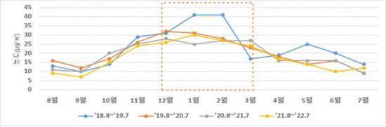 1일 시에 따르면 최근 4년간 12월~이듬해 3월 지역 초미세먼지 평균 농도는 28.6㎍/㎥로 연평균 농도인 20㎍/㎥ 대비 43% 높았다.