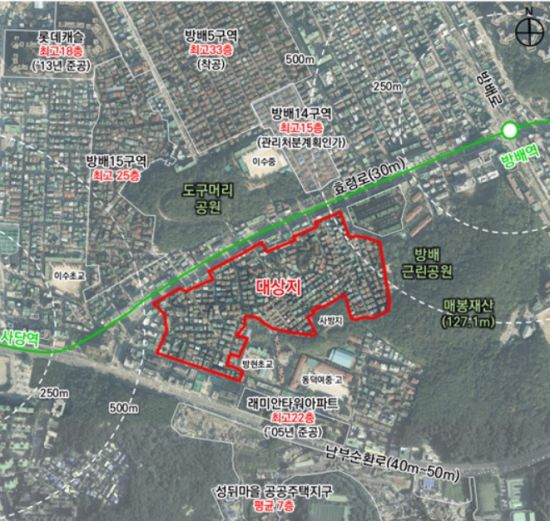 시는 이번 정비계획에서 최고 16층 이하로 계획됐던 높이 계획을 최고 22층까지 완화했다. 이를 통해 단지 중앙부에서 남북으로 통경축을 확보했다. 매봉재산 방재시설인 사방지의 안전을 고려해 주변 공원을 확대하고, 방배근린공원과의 접근성을 높이기 위해 공공보행통로도 계획했다.