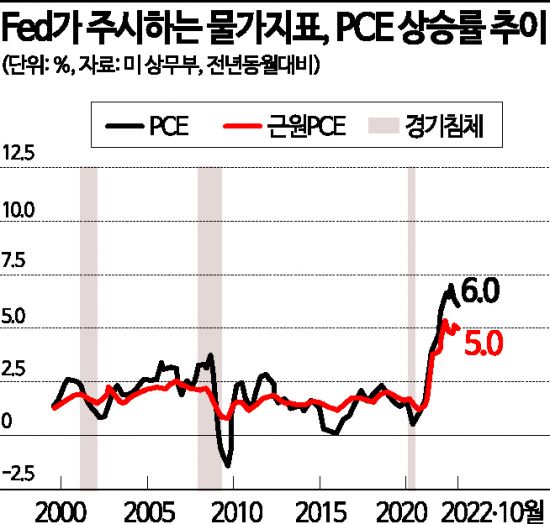 미 상무부가 1일(현지시간) 공개한 10월 미국 개인소비지출(PCE) 가격지수는 전년 동월 대비 6.0% 상승했다. 9월 상승폭(6.2%)보다 소폭 둔화하며 시장의 물가 피크아웃(정점 통과) 기대감에 힘을 실었다.