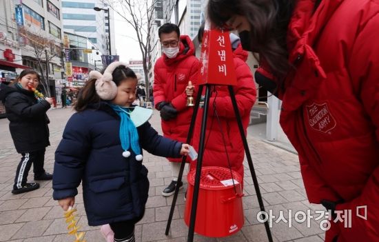 매서운 동장군이 기승을 부린 4일 서울 중구 명동에서 어린이들이 구세군 자선냄비에 성금을 넣고 있다./김현민 기자 kimhyun81@