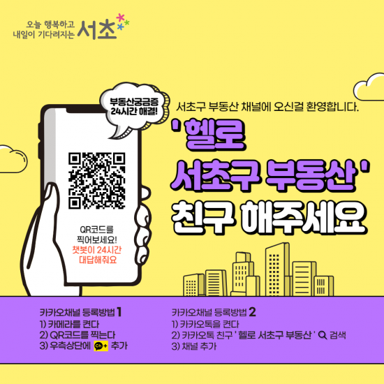 [서울시 자치구 뉴스] 서초구, 카카오톡 활용 ‘헬로 서초구 부동산’ 채널 개설로 부동산 정보 제공하는 챗봇 운영 & 24시간 자동응답 가능 언제, 어디서나, 누구나 부동산 관련 정보 얻고 궁금증 해결 & ▲주택임대차 신고 ▲개별공시지가 ▲조상 땅 찾기 ▲토지 합병 등 정보제공