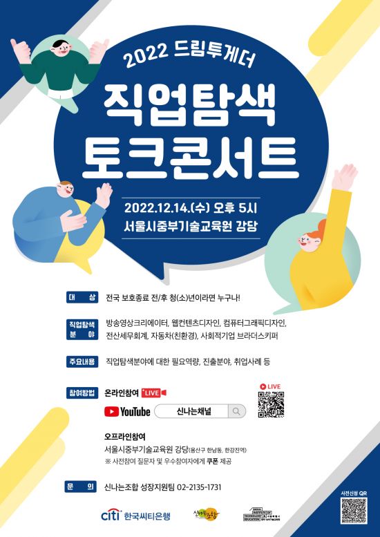 한국씨티은행은 '신나는조합'과 14일 오후 서울 용산구 서울중부기술교육원에서 이같은 목적의 ‘2022드림투게더 직업 탐색 토크콘서트'를 개최한다고 13일 밝혔다.