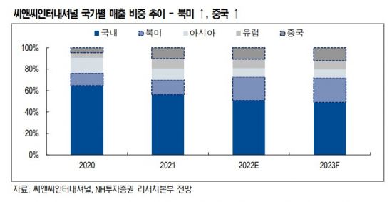 [아시아경제 황윤주 기자] NH투자증권은 16일 씨앤씨인터내셔널에 대해 4분기부터 내년 상반기까지 본격적인 리오프닝 국면을 누릴 것으로 내다봤다. 투자의견과 목표주가는 제시하지 않았다.