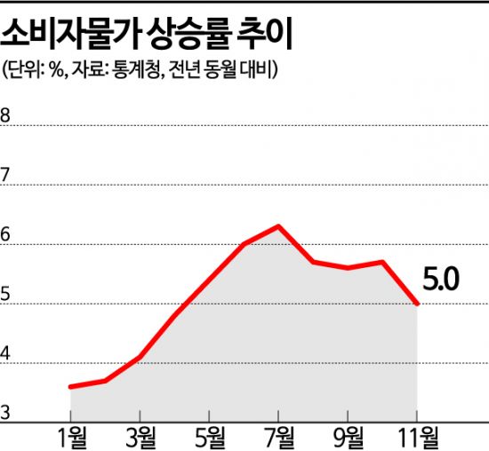 특히 정부의 영향이 없었다면 이 같은 근원물가 상승폭은 더 커진다. 정부가 직·간접적으로 가격 결정에 영향을 미치는 품목을 대상으로 만든 가격지수인 관리물가를 제외한 근원물가 상승률은 지난 7월 4.7%에서 8월과 9월 각 4.8%에 이어 10월 5.1%까지 높아졌다. 관리물가는 전기·도시가스·수도요금과 통신료 등 46개 품목이 포함된다.
