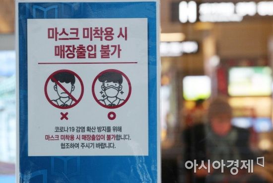 23일 서울 시내 한 서점에 마스크 착용 관련 안내문이 게시돼 있다. 정부는 이날 코로나19 중대본 회의를 통해 실내 마스크 착용 의무 조정안을 확정해 발표한다./김현민 기자 kimhyun81@