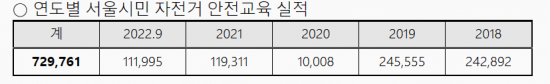 이에 더해 어린이, 학생, 성인 등 서울시민의 다양한 수요를 반영한 자전거 안전교육을 지속적으로 실시해 왔으며, 최근 5년(2018~2022.9월) 기준 약 73만명의 시민에게 교육을 진행하는 등 자전거 안전문화 확산에도 나서고 있다.