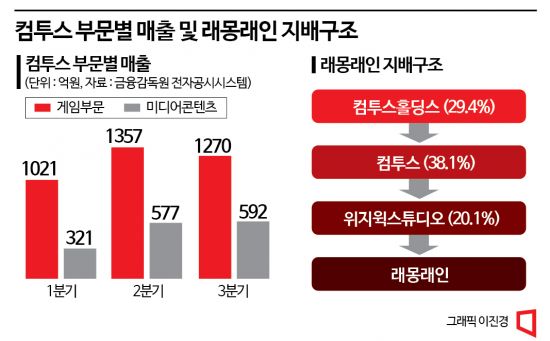 컴투스는 재벌집을 비롯해 콘텐츠 실적을 키우고 있지만 주력인 게임 사업에서 매출이 줄면서 그 효과가 희석되고 있다. 3분기 컴투스의 누적 매출을 5128억원이다. 이 가운데 게임 부문은 3648억원으로 전체의 71%를 차지한다. 미디어·콘텐츠 누적 매출은 1480억원으로 전체 매출의 약 28%다. 올 1분기부터 꾸준히 성장하며 전체 매출에서 차지하는 비중을 키우고 있다.