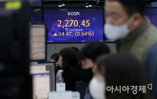 코스피가 전 거래일보다 12.22포인트(0.54%) 상승한 2268.20에 개장한 5일 서울 중구 하나은행 딜링룸에 관련 지수들이 표시되고 있다. 원·달러 환율은 전 거래일보다 0.7원 내린 1271.0원에 출발했다./김현민 기자 kimhyun81@