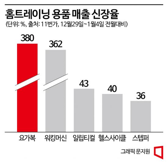 G마켓에서는 요가·필라테스용품 매출이 전월보다 60%, 승마운동기구 50%, 헬스용품 17%, 헬스사이클 8% 증가했다. 롯데온에서는 웨이트장비 120%, 요가·필라테스의류 60%, 헬스기구 30% 등 판매가 늘었다. SSG닷컴에서는 헬스·다이어트·요가 카테고리 매출이 50% 급증했다.