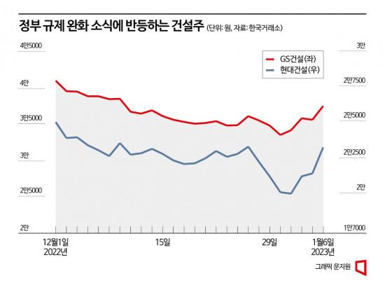 다만 정부가 부동산 규제를 완화한다고 해도 부동산 경기 회복까지는 시간이 걸릴 것으로 보인다. 건설업종의 투자심리가 살아나면서 주가가 반등했지만 추세적인 상승으로 이어지려면 고금리 기조가 바뀌어야 하기 때문이다. 고금리 기조가 꺾이지 않는다면 규제 완화에 따른 주택 실거래량 회복은 제한적일 가능성이 크다. 김선미 신한투자증권 연구원은 "주택시장은 당분간 더딘 흐름을 이어가겠으나 건설업종 주가는 2월 이후 안정화될 것"이라며 "2월 이후 주택지표 개선을 기대하기 때문"이라고 말했다.