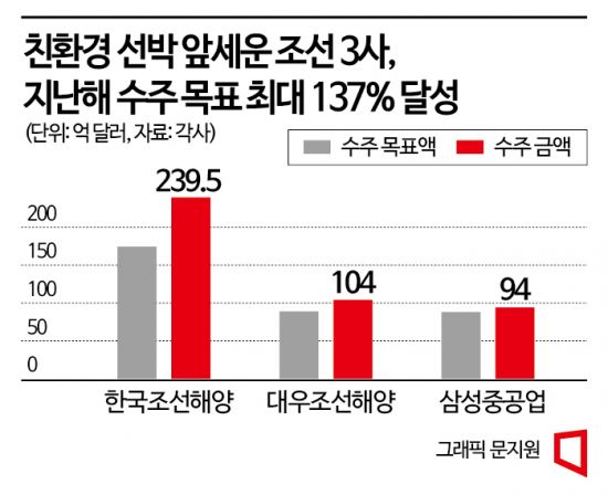 한국조선해양(현대중공업·현대미포·현대삼호)은 239억9000만달러(약 30조5200억원·197척)를 수주해 목표(174억4000만달러·약 22조1871억원) 대비 138%를 달성했다. 삼성중공업은 49척, 94억달러(약 11조9549억원)를 주문받아 목표 대비 107%, 대우조선해양은 104억달러(46척) 수주해 목표보다 116%를 각각 달성했다.