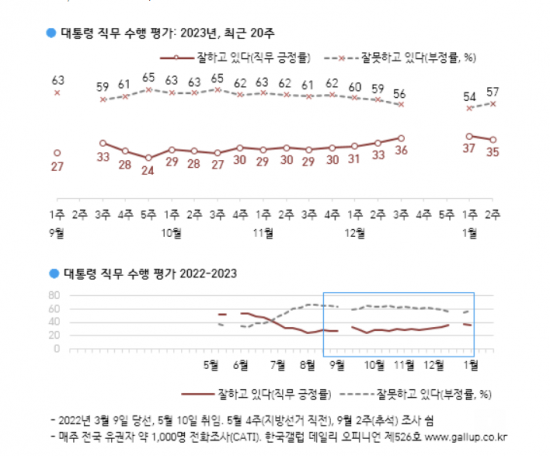 12일 여론조사기관 갤럽이 공개한 자체 정례 여론조사(10일~15일 전국 만 18세 이상 성인남녀 1002명을 대상으로 전화 조사원 인터뷰 방식으로 진행)에 따르면 윤 대통령이 지지율은 지난주 조사보다 2%포인트 하락한 35%를 기록했다. 지난해 11월3주 이래로 이어졌던 윤 대통령의 지지율 상승세는 이로써 꺾였다. 잘못하고 있다는 부정평가는 지난주 조사보다 3%포인트 오른 57%로 나타났다.