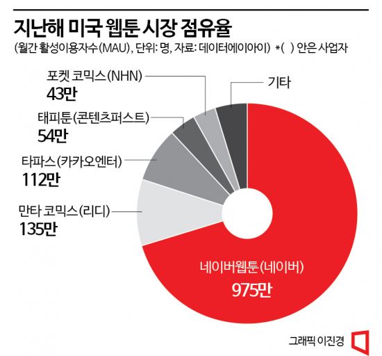 한편 지난해 미국 웹툰 플랫폼 시장에서 월간활성이용자(MAU) 1~5위는 한국 플랫폼이 차지했다. 모바일 시장조사업체 데이터에이아이는 네이버웹툰이 975만명(70.5%)으로 1위를 차지했다고 밝혔다. 리디의 만타코믹스(9.7%), 카카오엔터의 타파스(8.0%), 네이버웹툰이 투자하기도 한 콘텐츠퍼스트의 태피툰(3.9%), NHN의 포켓코믹스(3.2%)가 뒤를 이었다.