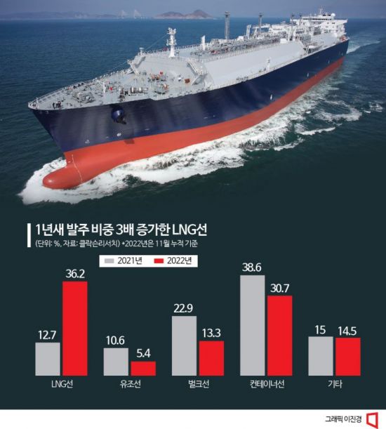 탄소 배출량을 줄이기 위한 친환경 선박 수요는 계속 늘어날 전망이다. 올해부터 IMO가 정한 선박에너지효율지수(Energy Efficiency Existing Ship Index·EEXI)와 탄소집약도지수(Carbon Intensity Indicator·CII) 기준을 준수해야 한다. 클락슨리서치는 “LNG선 비중은 지난해에 이어 올해도 견조한 수준을 이어갈 것”이라며 “한국 조선사들의 점유율이 증가할 것”이라고 분석했다.