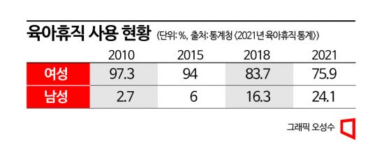 한국의 육아휴직 제도는 1987년에 도입됐고 1995년에는 남성의 육아휴직 신청이 가능해졌다. 특히 2010년 7만2967명이었던 육아휴직자 수는 2021년 17만3631명으로 증가했다. 성별 사용 현황에서도 남성의 육아휴직 사용률이 눈에 띄게 상승한 것을 확인할 수 있다.