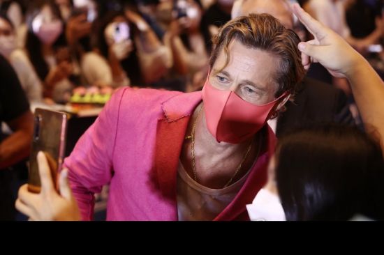 할리우드 배우 브래드 피트가 지난해 7월말 영화 '불릿 트레인' 시사회에서 팬들과 촬영을 하고 있다. 브래드 피트는 여성 패션의 전형적인 컬러인 핑크색 옷을 입고 등장, 눈길을 끌었다. [이미지출처=연합뉴스]