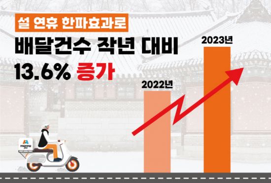 특히 전국에 한파가 몰아친 24일은 일일 배달 건수 약 56만 건을 기록하는 등 연휴 기간 중 배달 수요가 가장 많았다. 일주일 전과 비교하면 30%까지 크게 증가한 수준이다.